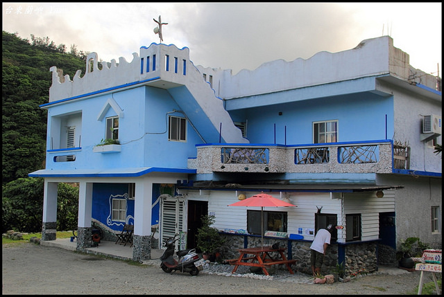 | 依循指標轉進之後,一棟遺世獨立的建築物聳立在眼前,那棟就是Yama的地瓜園,鄰近區域一棟建築物都沒有,因此感覺有在山林之中的飄渺感,建築物的造型彷如是座藍白色的城堡,雖然藍白色的色調會讓人覺得像是地中海風的造型,但我覺得藍白色才能表現蘭嶼藍天白雲,且熱情洋溢的意象, |
