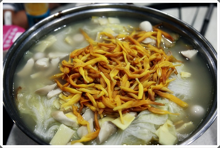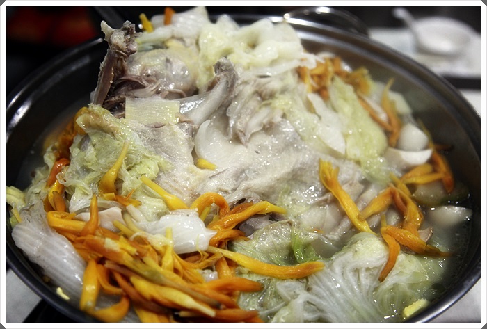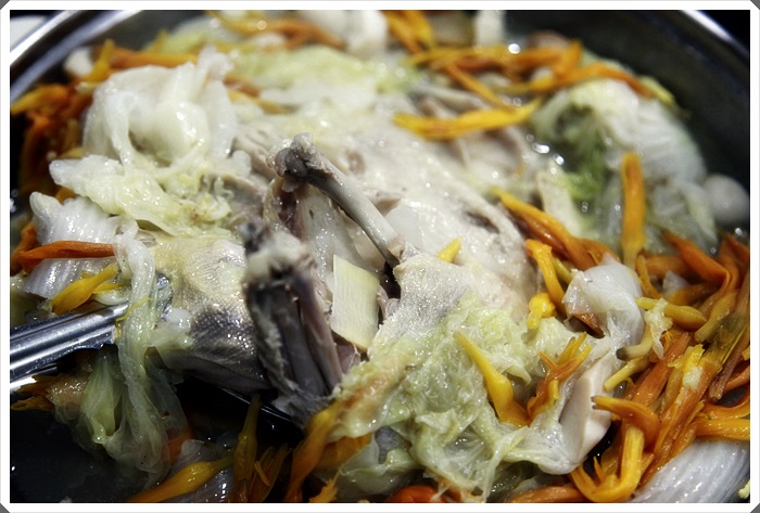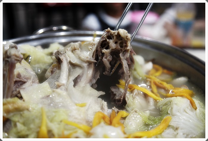 一整隻鴨放進高湯裡面加上大白菜跟金針菇還有老闆的配方下去熬煮兩小時,端上桌的啥後用大湯匙想把鴨撈起來拍的時候,一撈就散掉了@@