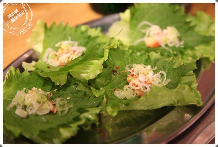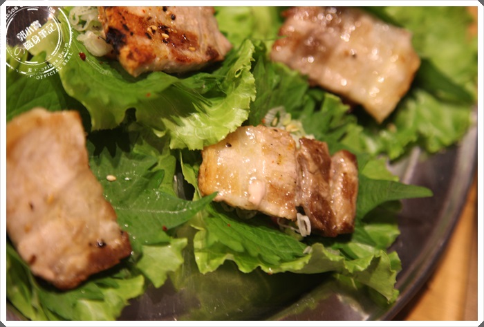 | 這吃法挺特別的,將烤好的豬頰肉放進紫蘇葉再包裹著生菜,灑下些細蔥,吃起來豬頰肉的口感十足,紫蘇葉的味蕾強烈,果真不一樣。 |