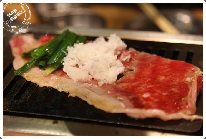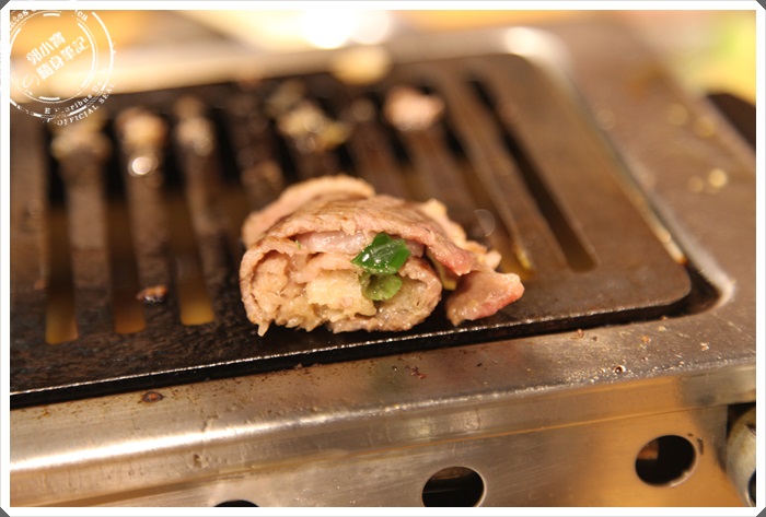 | 單烤一面等潮上麵血水滲出的時候在舖上韭菜跟細末捲成一團,再將它分段剪開入口,我一開始頗認為這樣會搶到很多好牛肉的鮮甜滋味,個人還是比較喜歡單獨品嘗肉的美味,但是吃了一塊後發現其實也還不錯,韭菜並沒有搶走太多肉的特色。 |