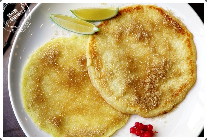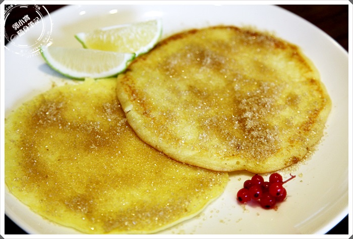一開始看菜單的時候我就對這個澳洲鬆餅特別有興趣,吃過那麼多國家的鬆餅就是沒吃過澳洲鬆餅,點來看完以後發現果然大不相同,與市面上的鬆餅還是大不相同,似乎是先將蛋跟麵粉攪拌後再下鍋煎的樣子?? 上面灑滿了砂糖,記得要吃以前一定要擠上那檸檬,因為擠上檸檬那才是最重要的一個步驟。