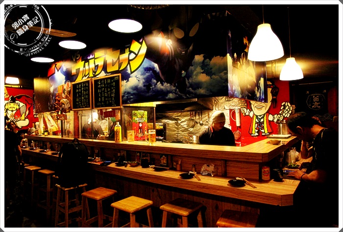 | 炭樵的整個烤台動線看起來非常的不錯,板前的位子可以容納到十來個人左右,可以清楚的看到烤台師傅燒烤的帥樣,但是上面的大圖輸出是鹹蛋超人讓我覺得滿可愛的XD |