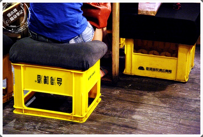 | 特別的是炭樵的椅子是自己改造的,利用台灣啤酒的置酒攔反轉舖上海綿墊後就是一張張相當具有特色的小椅子了。 |