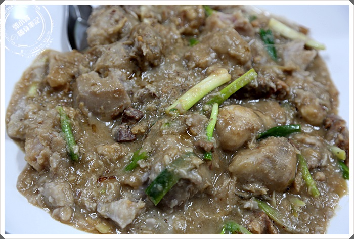 | 被阿兵哥用台語發音叫他唬爛肉,因為它就是芋頭跟肉炒一起,所以叫芋淋肉,台語就叫虎爛肉,還滿有趣的一段故事,大部分夾起來都是大塊的芋頭快居多,但老實說我個人不是很喜歡吃芋頭,所以我就沒什麼吃了,但是同桌的人吃的還滿開心的。 |