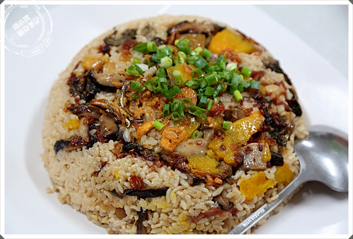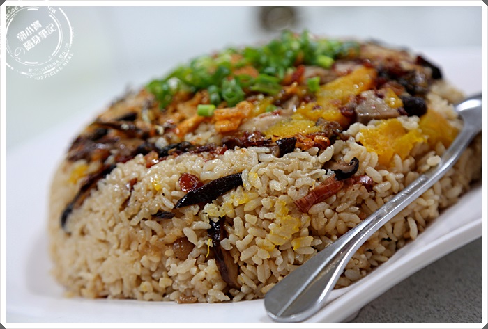 | 第一眼看到很單純的就是認為是普通的宴席上會出現的紅蟳油飯,但是仔細一看後才發現不是,理面有蚵仔、香菇、南瓜、芋頭,蝦米,蚵仔入油飯是還滿稀奇的,因為蝦米跟芋頭的香氣都非常的濃郁,搭配著其他食材所以味蕾層次變化滿豐富的,油飯是比較乾爽的那種,有點算是炒飯的口感,整體起來算是很特別的。 |