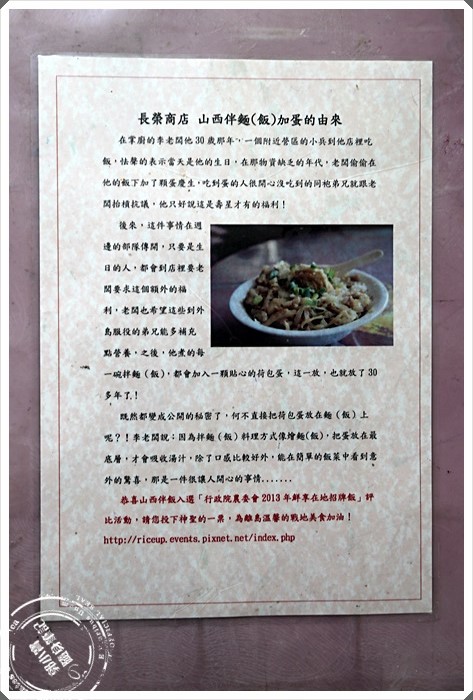 | 牆上貼著山西拌麵加蛋的由來,大概就是有個阿兵哥來這邊吃麵,跟老闆提到今天是他的生日,所以老阪在拌麵底下偷偷送個荷包蛋給他,她吃到下面的時候發現有一顆荷包蛋就非常的開心,看完後我心理面想著,或者一顆荷包蛋現在來說沒什麼,但是在那物質匱乏的年代理,人又身處在外島這地方,除了有好心的老闆加菜以外,還感受到那濃濃的人情味才叫人感動。 |