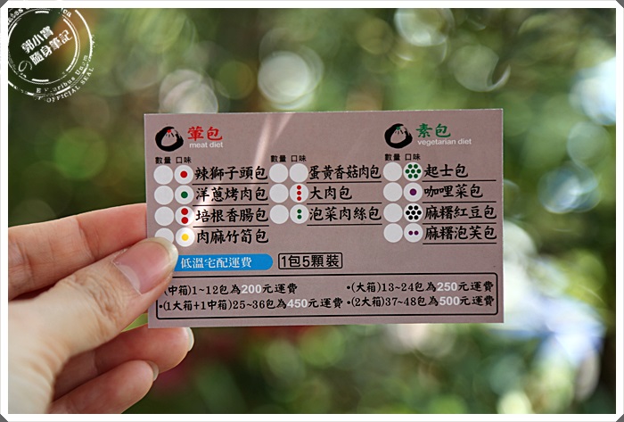 | 我們依然買了很多不同口味的包子,要如何分辨小杜包子的口味就在包子上面的紅綠點,每種包子都有不一樣的點法,名片上面都有註明。 |