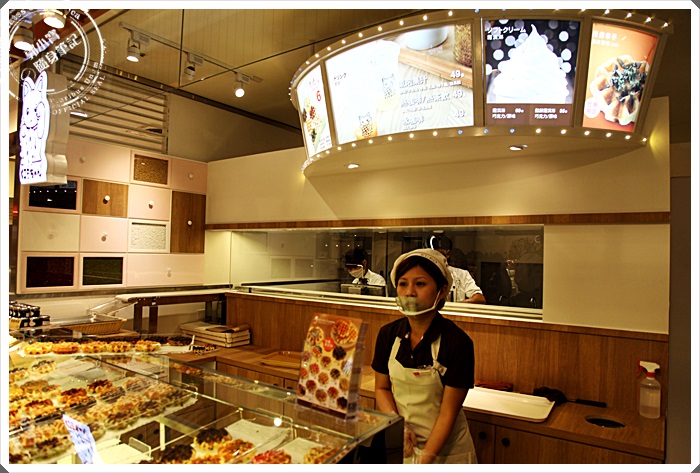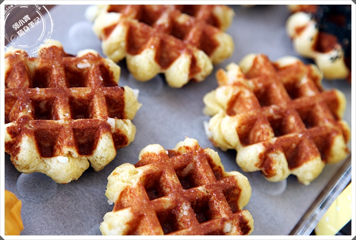 | 可以看到窗戶後面的師傅正在製做鬆餅,沿著白色的輸送機送到前方的桌子上,服務人員在分裝給客人,從小小的店面裡面一直飄送出那迷人的鬆餅香氣。 |