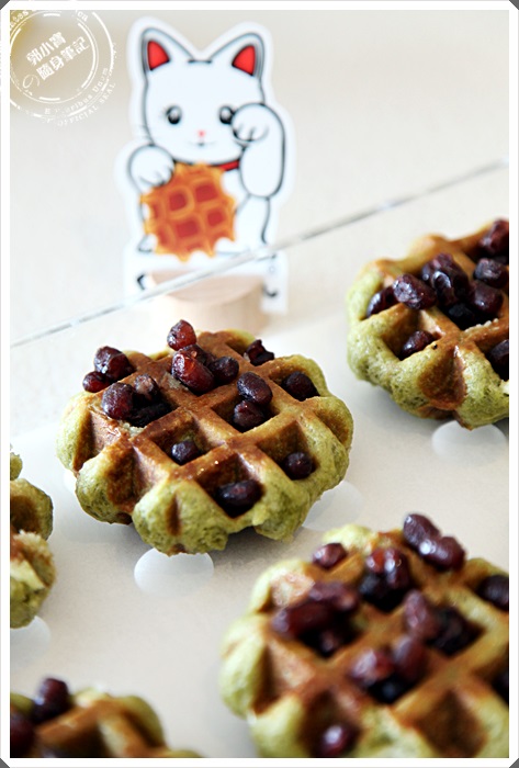 KUKO比利時鬆餅有幾款是有將原料加入麵粉裡面製作成鬆餅,抹茶鬆餅就是其中的一款,再打發麵粉的時候就一起把抹茶粉加入,所以鬆餅出來的顏色就是淡淡的抹茶色,當然這樣似乎日本味還不夠,在加上日本最愛的甜點伴侶,蜜紅豆!!!