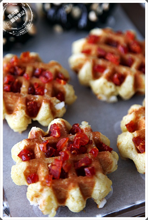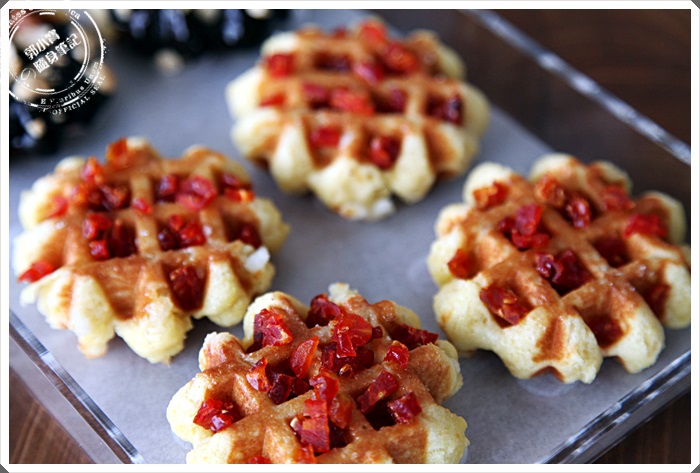 | KUKO比利時鬆餅也有一系列的果乾跟煎果的鬆餅,番茄果乾確實讓我有點驚訝到,基本上果乾系列在很多產品跟甜點類都會出現,但是番茄卻是很少見到,吃起來帶點淡淡的果香味,但是老實說我只知道是果香味,卻沒辦法準確的閉上眼一吃就認出他是番茄,果乾的果肉乾燥的還不錯,口感不會偏硬,反而有點QQ的口感,口感勝過果香給我的驚訝感,整體還是鬆餅麵粉的香味帶著果香衝上來。
