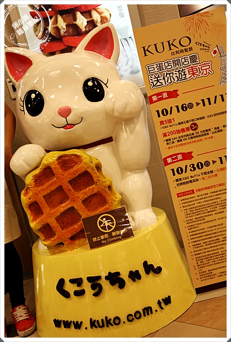 | 店門口的旁邊放著一隻巨型的可愛招財貓,真的是太可愛了,手上還拿著KUKO比利時鬆餅,這一隻招財貓是很多人經過會拍照的可愛公仔,一旁還有活動告示牌,文章最後會打上活動訊息。 |