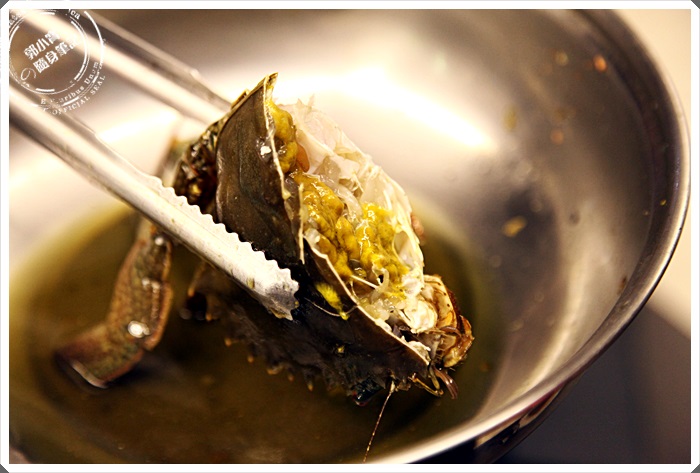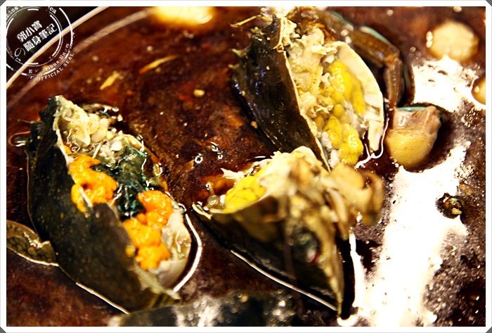 立馬就點了一隻沙公來吃蟹膏,沙母就準備來吃卵,店家把螃蟹夫妻剁成半後拿了盆子給我,要我們丟到鍋子裡面,螃蟹對切後還在動耶!!!