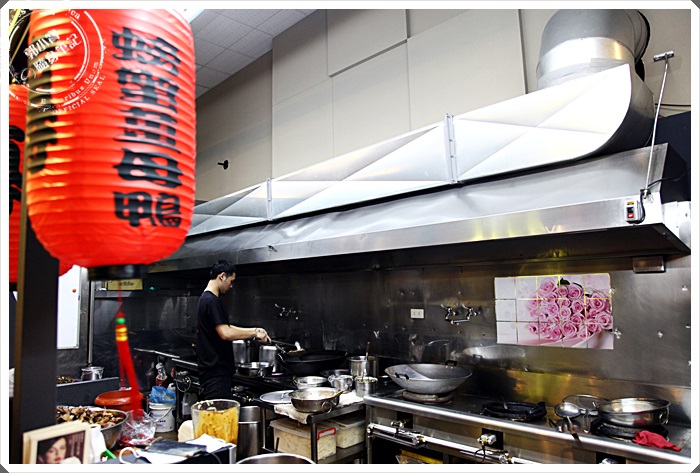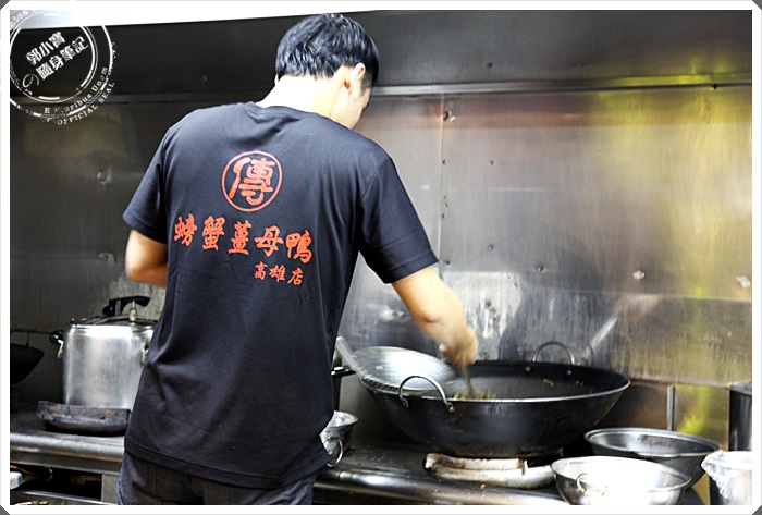 店內的廚房是開放式的,可以看到明亮乾淨的廚房,廚師正努力的吵著菜,大大的傳螃蟹薑母鴨就秀在制服上。