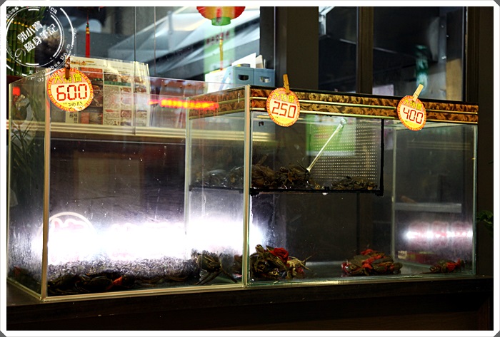 | 店外面就有幾個水族箱,裡面這就是這一家店的招牌,各式各樣的螃蟹種類,因為螃蟹種類的不同也有價錢上的差異。 |