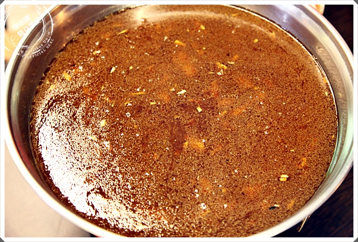 | 一上桌的時候,店家就會送上這一個鐵桶,裡面是醬汁,但是不知道是要沾什麼的,店家也沒交代我們,所以我們就沒理他了,這應該不是豆腐乳醬,因為後來我們有拿到薑母鴨的豆腐乳醬,但是跟我們一般吃到的豆腐乳醬不一樣,傳家的醬比較甜,整體風味也不太一樣,但是這幾家下來,我最喜歡的是霸味薑母鴨的豆腐乳醬。 |