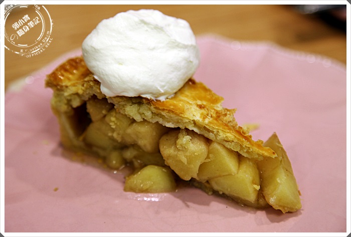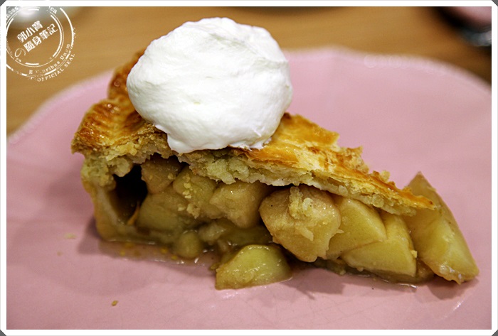 據說是不定期出現限定版的蘋果派,當天是3點後才出爐的,所以我們就立馬點了一快來看看,看到她的外表當場跟以前看過的蘋果派整個就大改觀了,大快的蘋果丁就夾在派裡面,外層的派皮相當的酥脆,說他酥脆卻又很紮實,而且風味跟一般吃到的蘋果派是不一樣的,本來以為會有點微酸,但是Miss V Bakery它們家的蘋果派是甜的,甜而不膩加上香酥濃郁的酥皮,上面還有一層清爽不膩的奶油,真的超對味的,絕對可以顛覆你對蘋果派的想法,這一份真的相當的強大XD