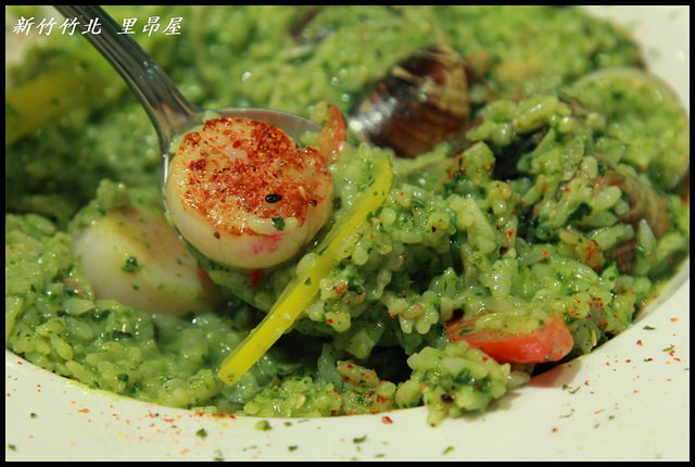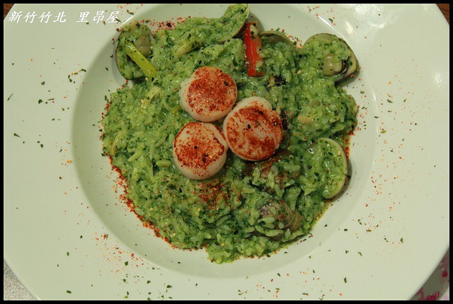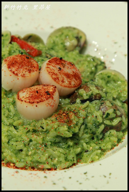 | 青醬蛤蜊干貝燉飯(NT.240),雖然照片上看不太出來,但這蛤蜊干貝燉飯的料真的很澎湃,除了顯而易見的三個乾煎大干貝之外,蛤蜊的數量也是多到爆(雖然蛤蜊跟青醬融為一體看不太出來XD),而且燉飯的數量還不少,看起來就夠讓人食指大動, |