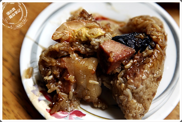 | 內餡先當的紮實且豐富,一大塊肥肉跟瘦肉,還有香菇跟魯蛋,幾乎都快撐破糯米跑出來了,我只能說每一口都是滿滿的幸福及滿足。 |