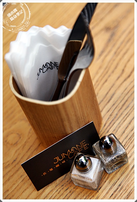 | 佐曼咖啡館點好餐後,工作人員就送來了餐具,餐具是用木桶裝著,避免直接接觸到桌面,也一起送上來了鹽罐跟胡椒罐,質感相當的棒。 |