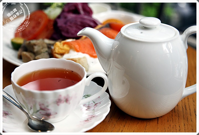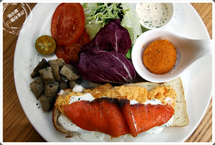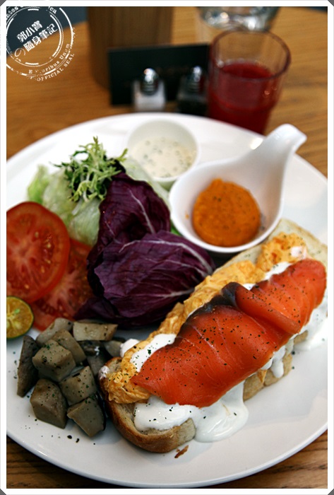 這套餐最主要吸引我們的還是煙燻鮭魚,每次看到早午餐有煙燻鮭魚總是很難讓我們不點它,加上從菜單上看它的配料都相當的豐富,所以就點了,送上來的時候完全跟菜單上的照片一模一樣,真好!!