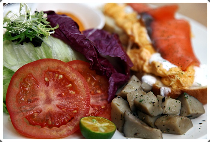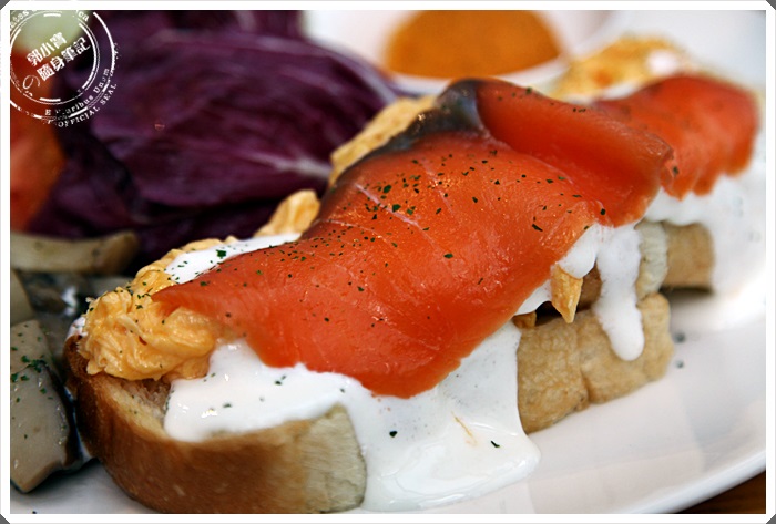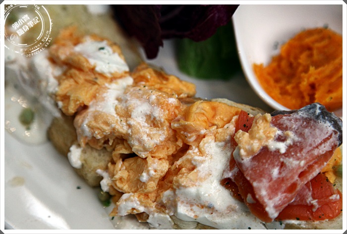 | 煙燻鮭魚的底下是鮮奶土司舖上滑嫩的炒蛋,淋上店家特製的酸奶,一口咬下就可以吃到那濃郁的蛋香味,鮮奶土司也相當的鬆口,帶點酸奶的衛道整個就是清爽無比,吃起來一點負擔都沒有,如果再搭配煙燻鮭魚的話,整體口感豐富的層次令人驚艷。 |