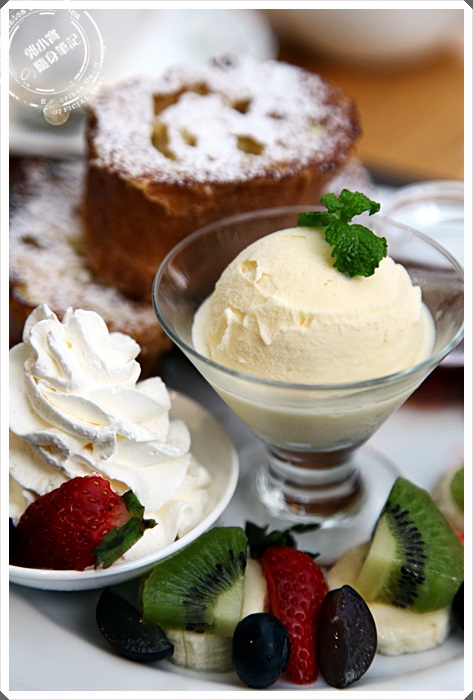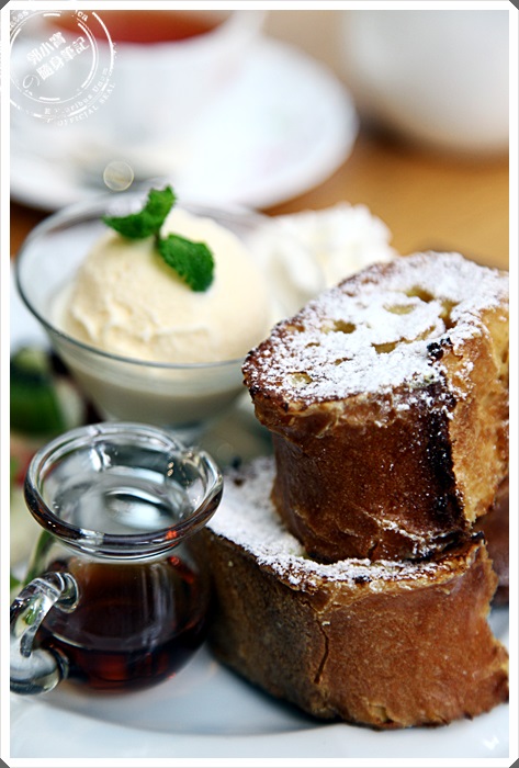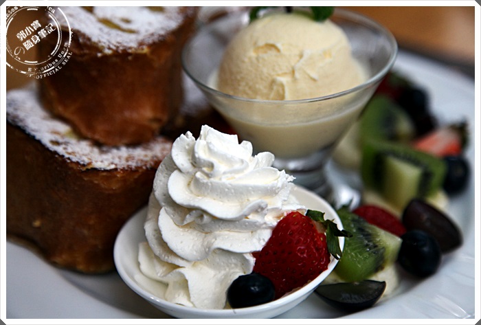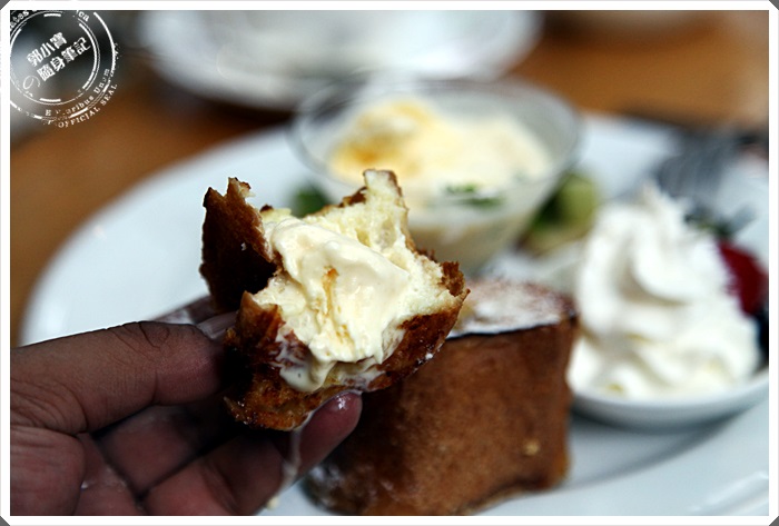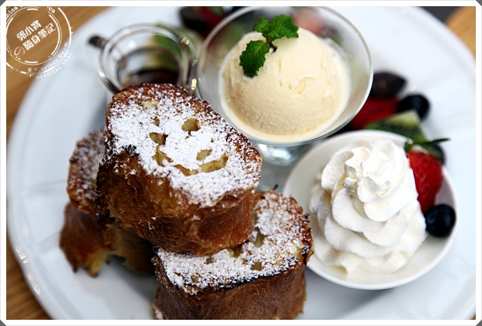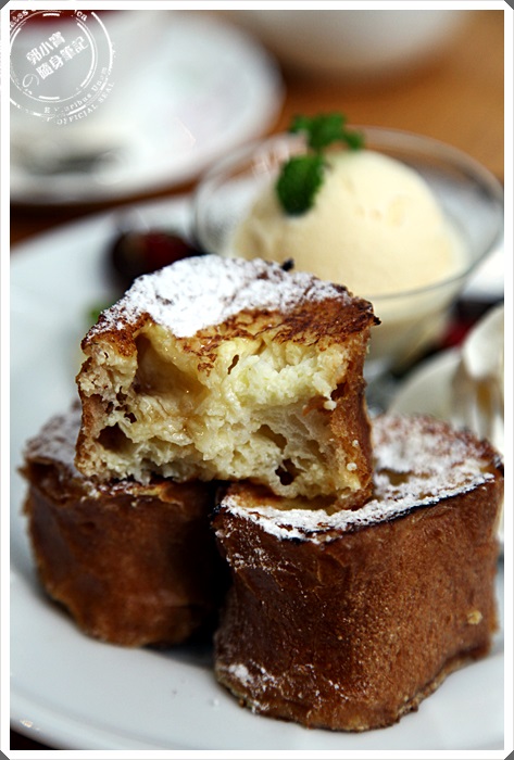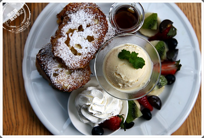| 這份套餐除了主角法式歐蕾吐司以外,還有一球香草冰淇淋跟奶油,挖了一口奶油小嚐一下,奶油還滿清爽的不膩的,冰淇淋是香草口味的,還滿好吃的,這些都可以當作佐料途抹在歐蕾吐司上面,但是我個人覺得歐蕾吐司單吃就相當好吃了!!! |