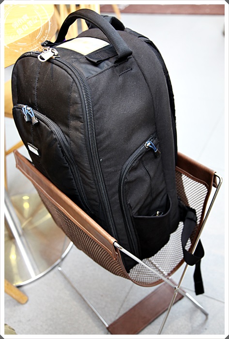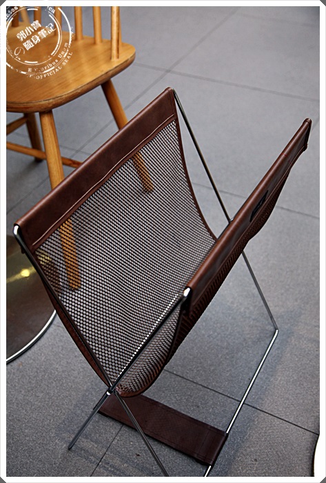 | 佐曼咖啡在我們選擇了座位後,發現我們還有攜帶包包後,馬上送上來了一個包包置物架,這一點相當的貼心,這置物架滿像折疊式座椅的,小寶拿了相雞包來試試看,因為相機包通常相當的大,但是依然可以輕鬆放進去。 |