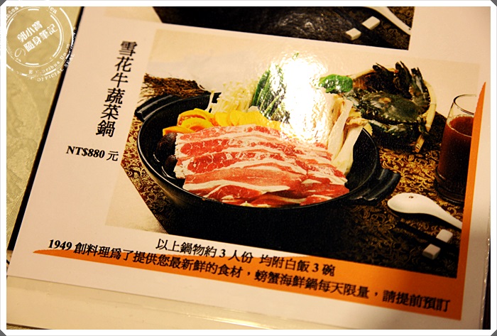 1949創料理的菜單還滿多頁的,除了有商業午餐以外,品項真的相當的多樣化,從火鍋到中式大菜到港點琳瑯滿目的都有,所以不管是想吃正餐或是下午想吃個港點通通都有!!!