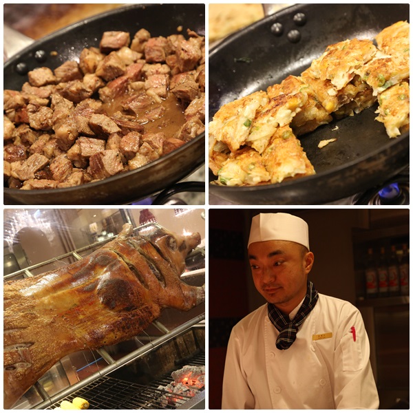 | 除了前台有炒飯以外,還有提供海鮮煎餅跟牛肉切丁,鐵阪師傅炒完後都會放在前台的平底鍋加熱持續保溫,讓每個客人吃到的都是熱騰騰的,誇張的是這邊還有烤乳豬,但是這隻烤乳豬只能看不能吃,因為今天烤的是要給明天的客人吃的,別傻傻的在等烤乳豬好,烤乳豬的餐台就有放著已經烤好的乳豬切片!!!! |
