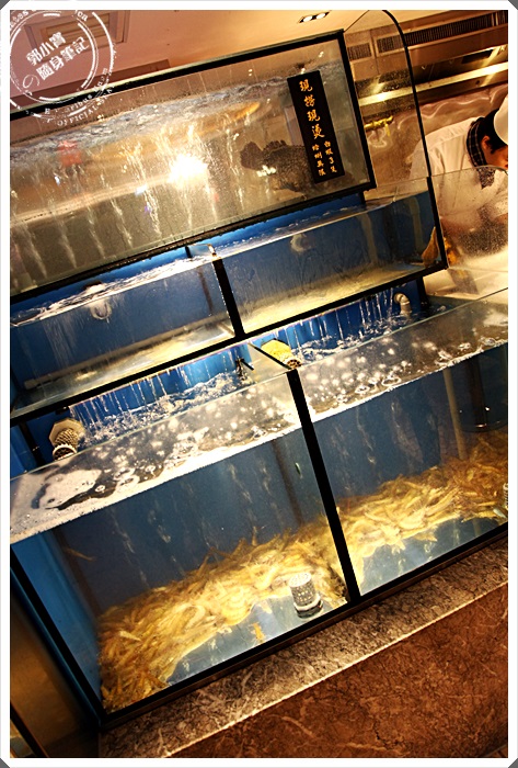 | 旁邊有一個階梯式的水族箱,據說本來是要給一家大小的親子互動的,撈活蝦現煮,但是因為幾乎全部的客人都不想沾濕手,所以變成了水族箱,詢問了一下工作人員後,他們表示其實並不會把裡面的死蝦撈起來烹煮,內場還是使用新鮮的活蝦做料理,其實這水族箱應該徹掉會比較好,避免消費者擔心會用水族箱的死蝦來烹煮。 |