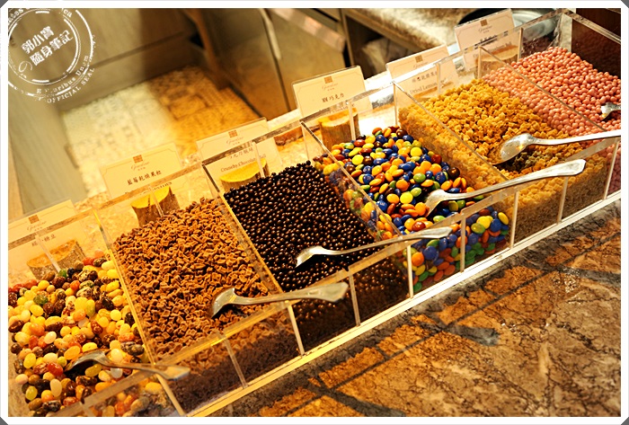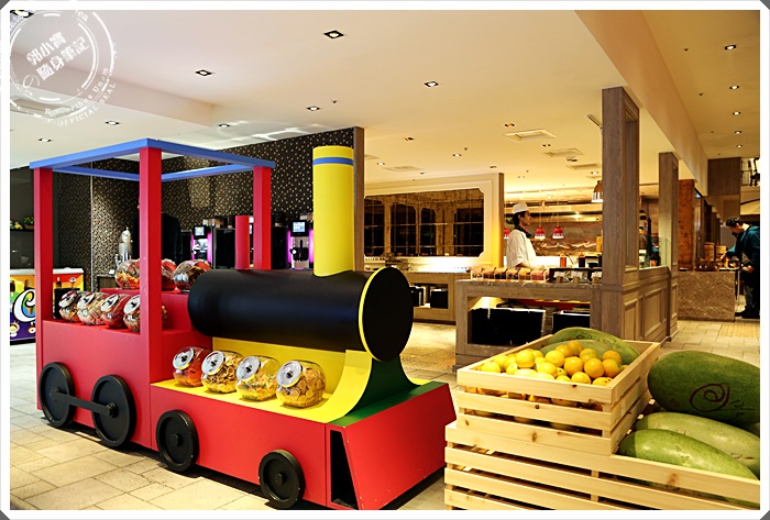 小火車的造型是小朋友專屬的區域,上面放了相當多的餅乾零食,上面的玻璃罐營造出大人們小時候的雜貨店的零食櫃。 |