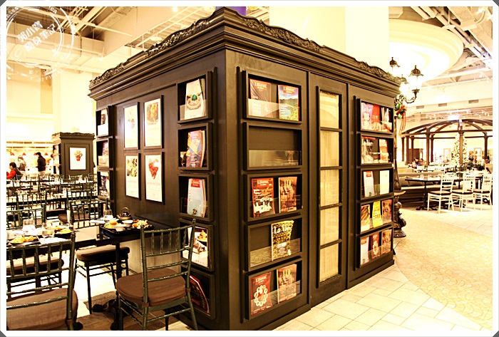 | 用餐區內可以看到好幾個這樣彷彿在義大利街頭會看到的書報攤,外面擺設的書報雜誌都是可以拿回家的,裡面除了有很多時尚流行資訊以外,還有一些旅遊資訊,我們還一邊吃一邊看,就知道我們把自助餐當成下午茶吃有多舒服了,但是這書報攤可是大有玄機,裡面就是整理客人用餐後的餐盤跟廚餘回收的地方,巧妙的把客人不想看到的通通規範再裡面,讓客人擁有最佳的用餐環境。 |