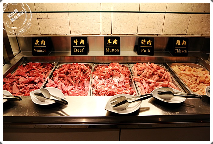 | 蒙古烤肉區旁邊就有各類的肉品,從牛肉到羊肉、豬肉、雞肉還有鹿肉通通都有,我個人喜歡每種肉都給它夾上一點,看看有沒有辦法一口吃下有金庸小說裡面提到的小羔臀肉般的美味,五種肉混再一起的美妙滋味,夾完了肉品後再夾蔬菜,全部都夾到碗裡面後就可以送到老師傅的送菜口,過沒多久就一碗香噴噴的蒙古烤肉出爐了,說真的相當的好吃,肉汁滿碗啊!!!! |