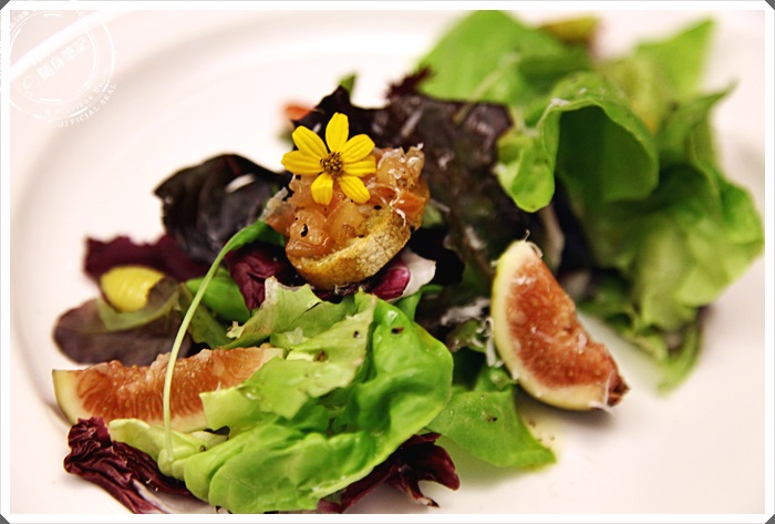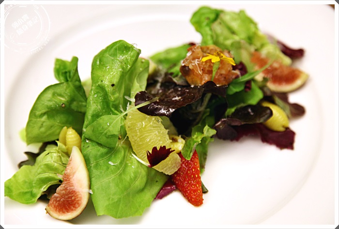 | 無花果本身在西餐的部分就相當的常見,主要它本身的含糖量就相當的高,加上口感氣味獨特,又含有豐富的營養,大部分都被乾燥過,但是在這邊卻是新鮮入菜,搭配著新鮮的生菜及萵苣,酒醋醬的味道淡了一些,但卻已無花果及草莓酥甜滋味提升生菜的多水分,簡單卻又爽口。 |