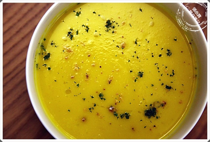 | 說是南瓜湯,但是顏色卻鮮黃的緊,與一般市面上的南瓜湯不太相同,沒有加入香濃牛奶熬煮,主要就是以南瓜剁泥後在灑上榛果碎片熬煮,聞起來非常的香,但是喝起來卻是頗為意外的清淡,少了香濃的牛奶卻意外多了南瓜的小清甜,剛喝一兩口的時候感覺口味太淡,喝了半碗後就可以慢慢的感受到南瓜的鮮甜,搭配著碎粒的榛果紗棉口感,倒有像是南瓜細粥的感覺,喝完後相當的舒服,整個胃都暖和了起來。 |