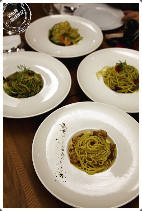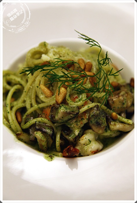 | 相當清爽的青醬義大利麵,裡面的蝦子也相當的新鮮,來聊聊這青醬的味道有甚麼不一樣,基本上這青醬除了使用羅勒的品質相當的不錯以外,在打青醬的過程也沒有添加過多的油品,所以吃起來不會感覺過油,淡淡的青醬味也不像是用台灣九層塔來製作的,在口中咀嚼後就可以感受到多層次的風味慢慢出來,前端的青醬搭配後端的起司粉慢慢散發出獨特的奶油青醬的口感,是相當特別及美味的一道義大利麵!! |