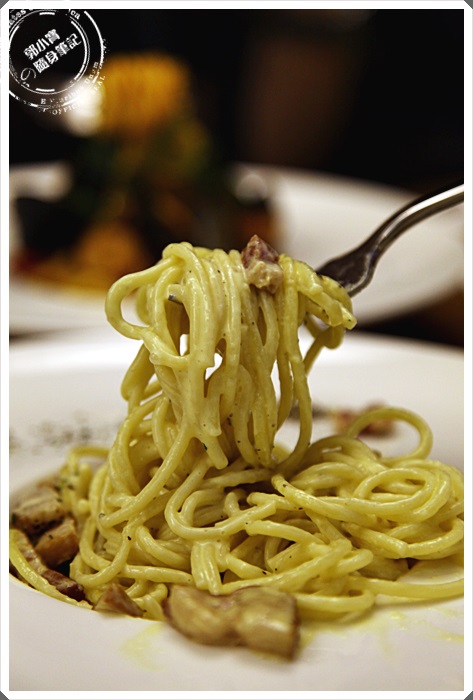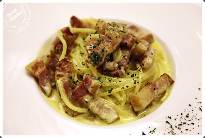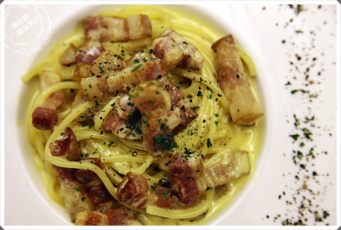 | 如果你不敢做太多的嘗試,那就建議點上一份基本盤的奶油培根,可以享受到生麵的口感以外,還可以擁有熟悉的奶油香氣,8%的奶油培根香氣也是頗有獨特,除了奶油的香氣以外,還嚐到一絲的黃油香氣,大口吸義大利麵的時候可以感受到它較具有黏性及油潤的湯汁,培根採用肉絲條的做法,讓入口的時候比較有吃到肉的感覺,且培根條上帶有肥肉,搭配義大利麵吃起來也比較不會乾燥。 |