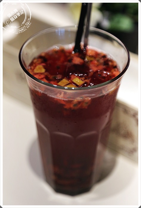 | 相當特別的一個飲品,最主要是把水果茶跟花茶結合在一起,入口的滋味帶點酸甜主要來自於醃製水果跟百香果籽,舉杯吸飲的時候又可以聞到甜膩的花香氣跟百香果氣息,對於女孩子來說是一杯會讓人喜歡的飲品。 |