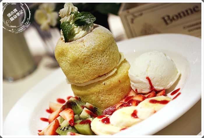 | 鮮果森林厚鬆餅一送上來的時候,我幾乎都不想拍照恨不得立即把它吃進肚裡,看起來相當的蓬鬆,下午茶美食其實最快樂的就是這個時間,幻想著這些甜點下午茶的廚師們可以有甚麼不一樣的變化跟火花,這也是我第一次看到這種厚鬆餅,高度相當的高,感覺是堆疊了兩個小蛋糕的高度,金黃色的鬆餅體灑上糖霜真的相當的好看!! |