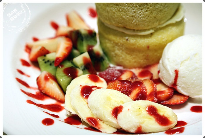 | 一旁的水果也滿豐富的,除了香蕉切片以外還有當季的新鮮草莓跟奇異果,淋上鮮紅色的草莓醬增加甜度及香氣,每一口水果都相當的甜蜜! |