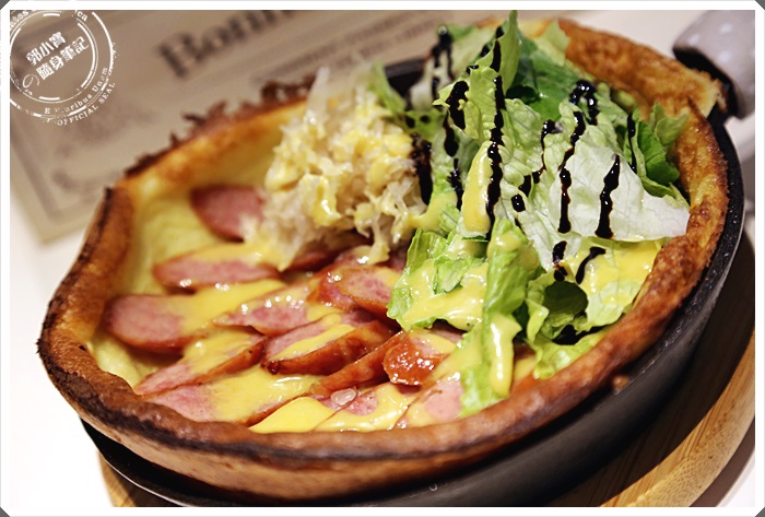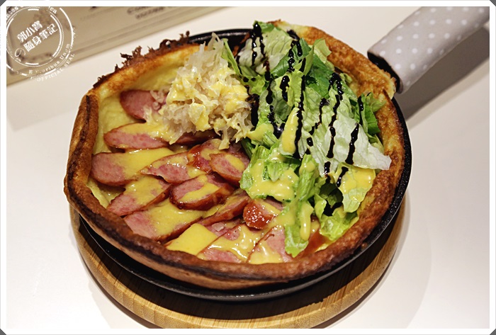 鑄鐵鍋鬆餅最重要的就是火侯的控制,上面擺滿了德式香腸切片與生菜,在拍照的途中經過一小段時間就可以發現它越來越不澎了,所以記得一定要趁熱吃最好吃!!!
