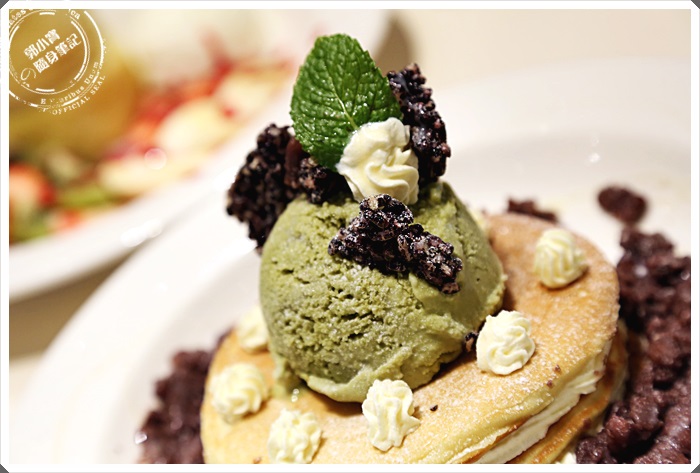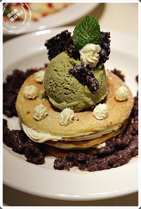 | 抹茶冰淇淋的部分可能是凍的太硬了,所以吃起來並沒有特別的濃,等到大概化了一點在塗在鬆餅上味道就濃郁許多了,我個人是喜歡把抹茶冰淇淋跟奶油混在鬆餅理,讓鬆餅吸附著抹茶冰淇淋。 |