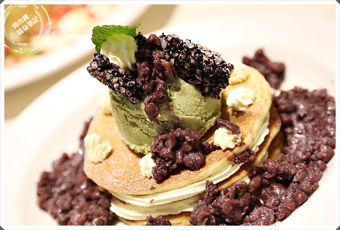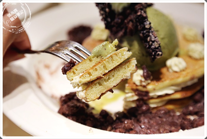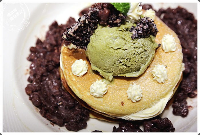 | 這一份餐點完全是看中紅豆跟抹茶才點的,送上來的時候果然色彩相當的繽紛,搭配的也相當的吸睛,中間有雙層鬆餅內餡塗滿奶油,鬆餅上面有一球玄米抹茶冰淇淋,周圍則是鋪滿了紅豆泥。 |