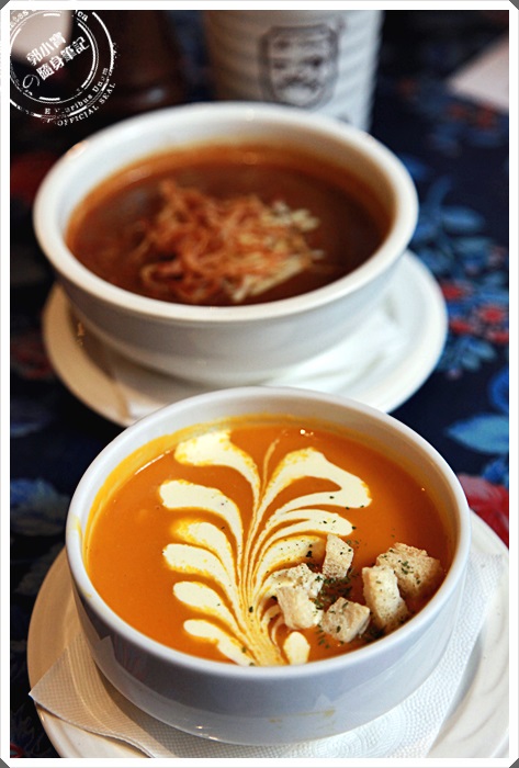 | 湯品的部分也有四種口味可以選擇,我們選擇的口味分別是相當經典的法式南瓜濃湯跟洋蔥湯,湯碗份量都還挺大的,給的量也相當的足。 也可以加價製作成酥皮系列。 |