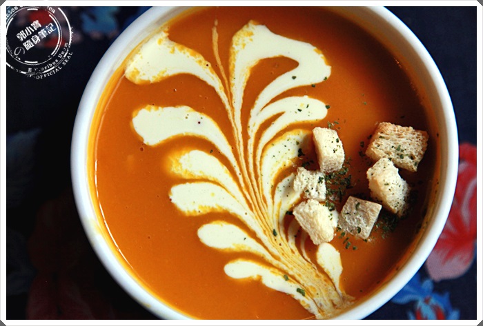 Mr.Onion的南瓜湯入口味道比較淡了一點,但是香氣卻是挺香的,我個人還滿喜歡這樣的口感,因為現在放進去嘴巴太濃郁我反而都會害怕,喝起來沙沙的口感似乎是南瓜的碎泥。 |