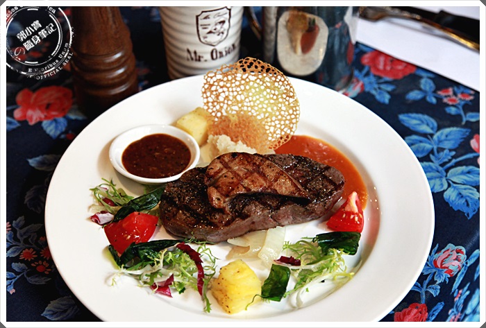 | Mr.Onion牛排館主要是走美式排餐,所以醬料都不會直接淋在牛肉上,分別是放在小瓷盤上依照個人口味沾醬,牛排是放在加熱過後的瓷盤,上來的時候瓷盤還挺燙手的,這一點可能要小心一開始別碰到磁盤,但是可以保持著牛肉的熱度跟鮮嫩。 |