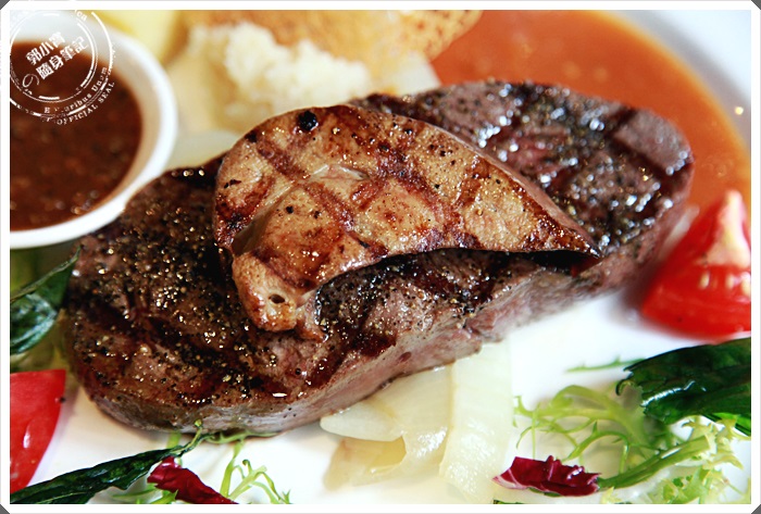 | 菲力的條紋烤的相當的漂亮,側面看起來血水也相當有揪C感,上面還有主廚特製的粉肝,不管是單吃還是配著一起吃都相當的適合,先切了一塊粉肝吃了一口,相當的滑口且沒有腥味,油脂相當的豐富且回甘,這粉肝真的相當的好吃,搭配牛肉的鮮嫩與甜度,更能提升出牛肉的美味。 |