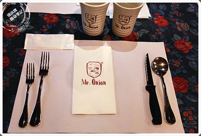 Mr.Onion牛排提供的餐具也頗為精簡,我喜歡它們底下的花布給了不一樣的感覺,大部分美式排餐都喜歡紅白條紋或是紅白格紋的桌布,有這類型的暗色系花布感覺也滿新鮮的。
