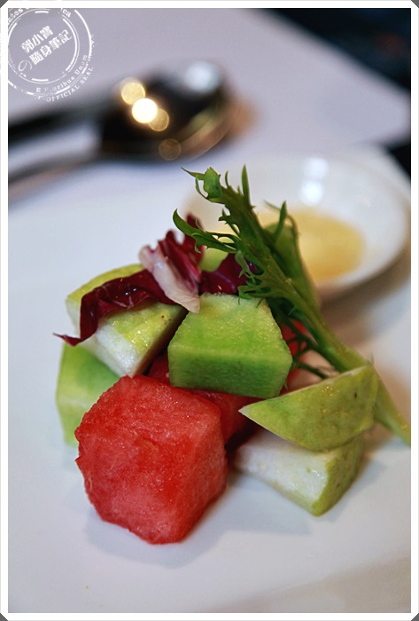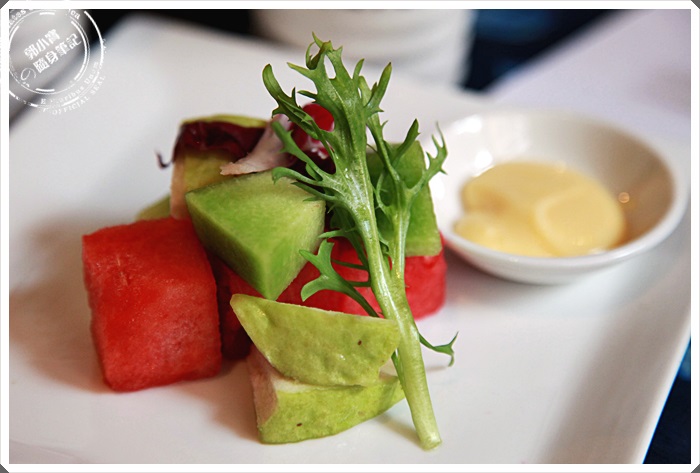 | 沙拉的部分每天都是不一樣的,看各店的主廚當天配的沙拉為主,但是我滿喜歡這一次的水果沙拉的,不用沾醬就可以先吃點水果墊一下肚子,水果的甜度都還不錯且也相當的新鮮。 |