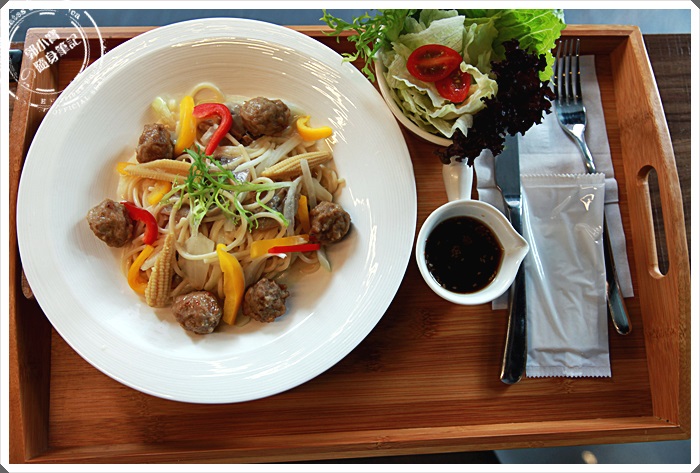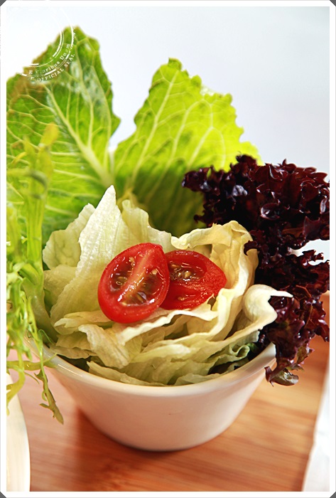 | 點好義大利麵後過一下子餐點用一個木托盤送了上來,沙拉跟餐具都在上面了,感覺相當的鄉村風。 |